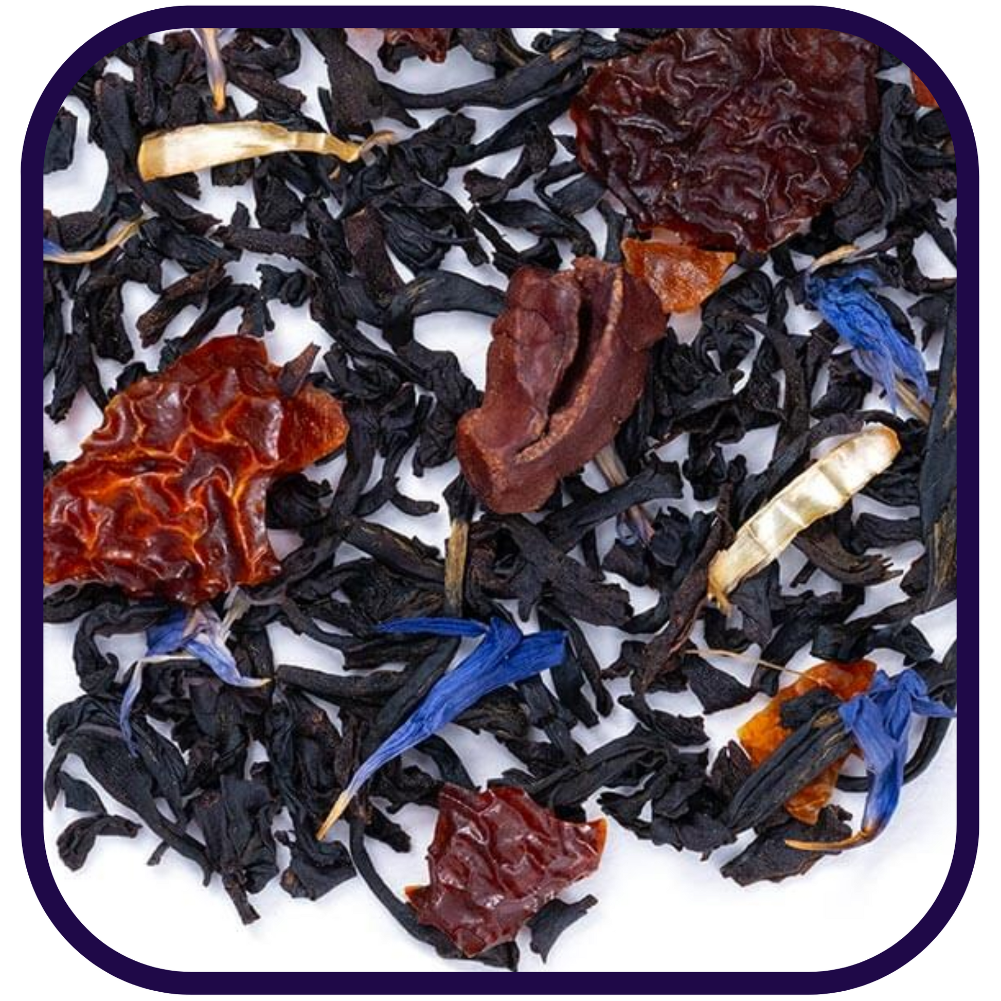 Ingredients: Black Tea, Keemun Concerto Tea, Rose Hips, Cocoa Nibs, Lapsang Souchong Tea, Whiskey Flavor, Blue Cornflowers, Natural Candy Apple Flavor & Natural Vanilla Flavor