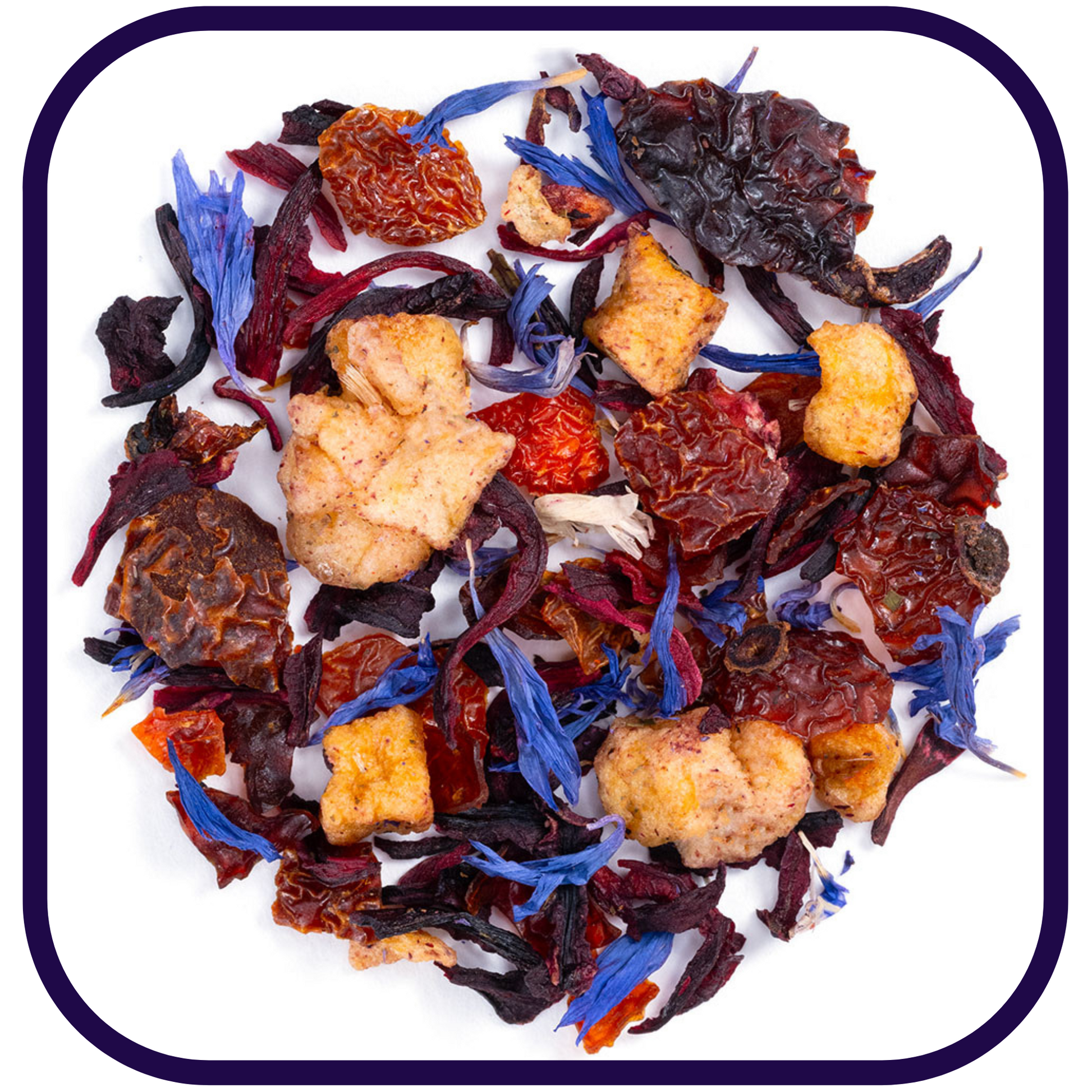 Bright hibiscus and juicy apple pieces lend a refreshing tartness, while creamy undertones wrap your senses in silky softness. Raspberry leaves, rose hips, and blue cornflowers layer in floral magic for a full faerie feast.