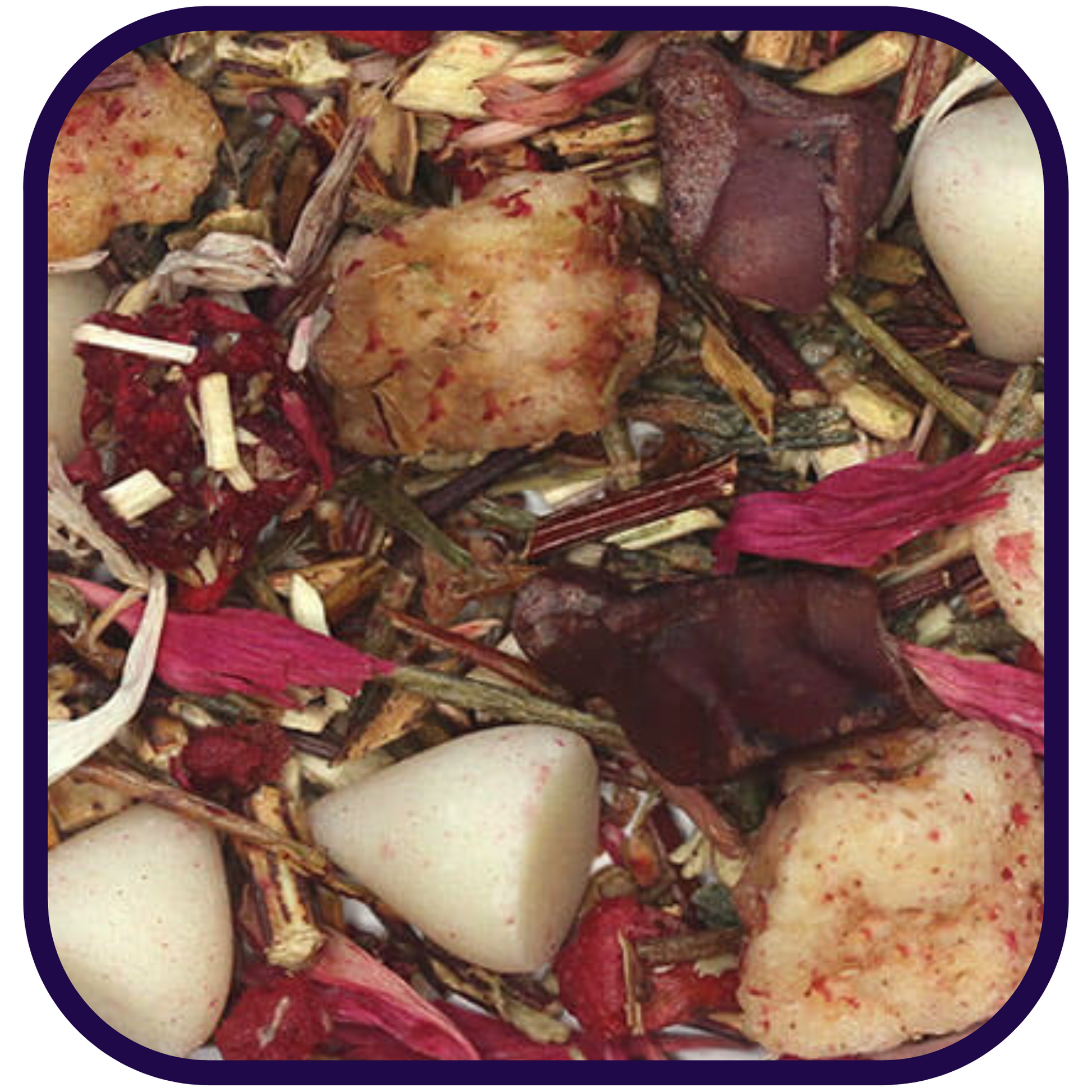 Ingredients: Green Rooibos Tea, Apple Pieces, Mini White Chocolate Chips, Cocoa Nibs, Raspberries, White Chocolate Flavor, Natural Raspberry Flavor, White Cornflowers & Red Cornflowers