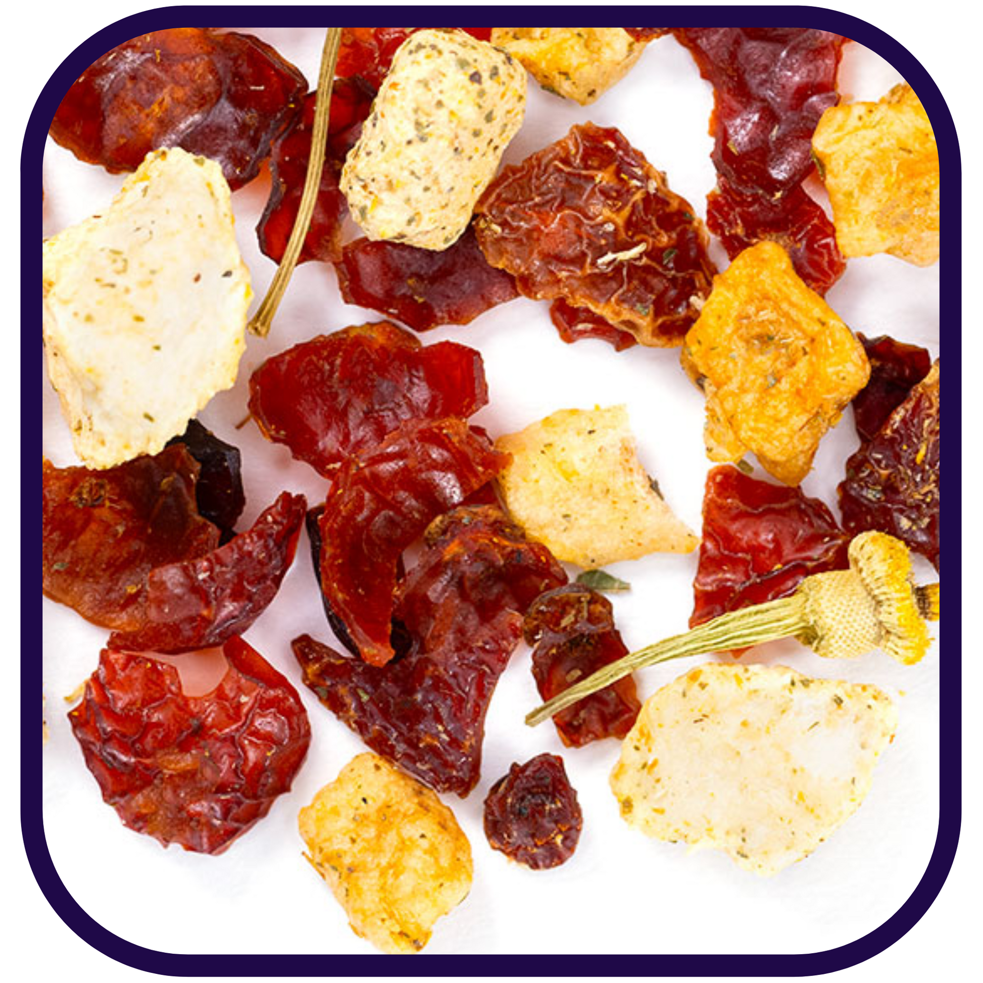 Ingredients: apple pieces, rose hips, natural peach flavor, pineapple pieces, chamomile flowers, lemon verbena & peach pieces