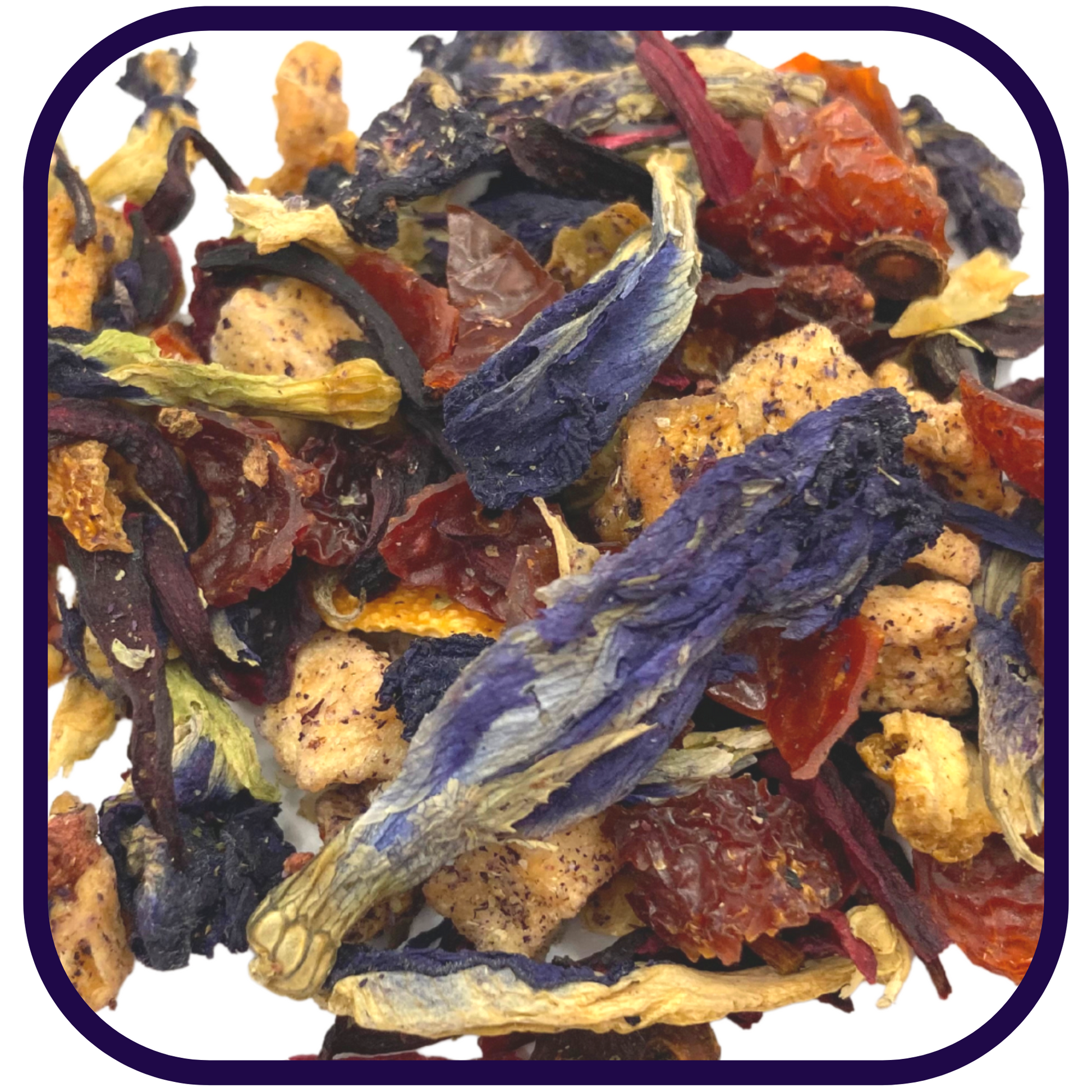 Ingredients: Apple Pieces, Hibiscus, Butterfly Pea Flower, Rose Hips, Orange, Papaya Flavor, Blueberries, Strawberries & Natural Blackberry Flavor