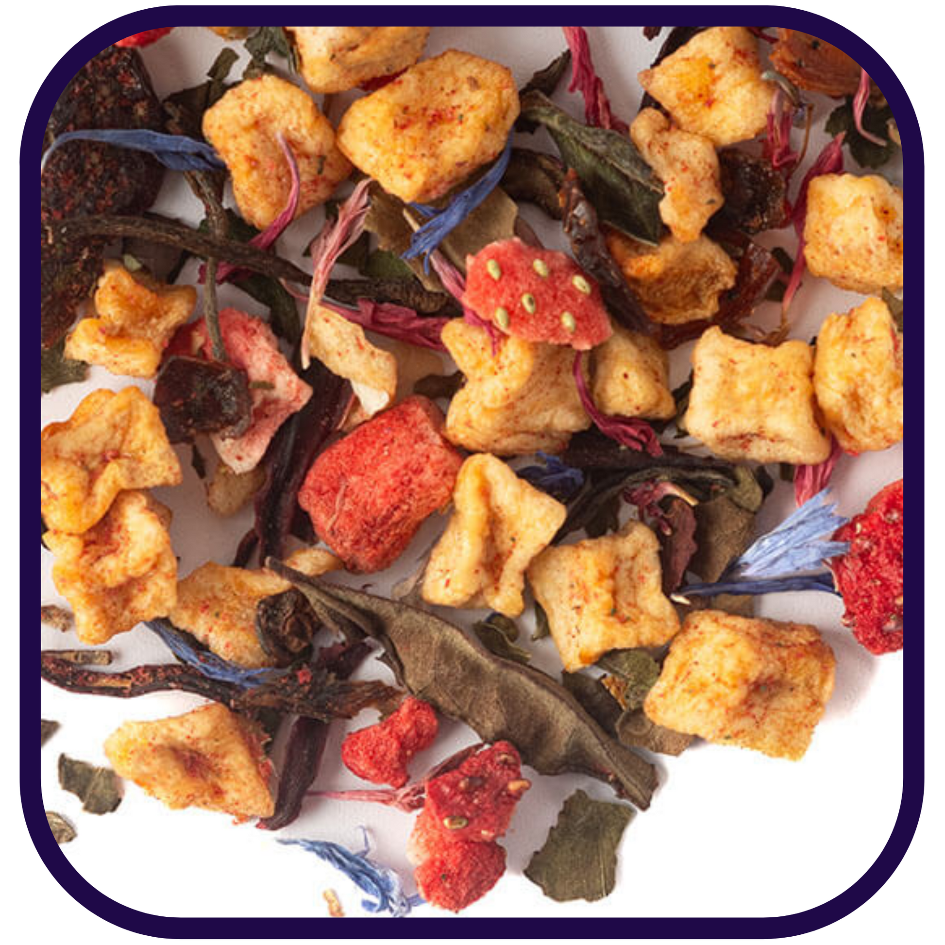 Ingredients: apple pieces, rose hips, white tea, hibiscus, raspberry leaves, strawberries, lemon, cherries, blue cornflowers, red cornflowers, natural apricot flavor & natural grapefruit flavor
