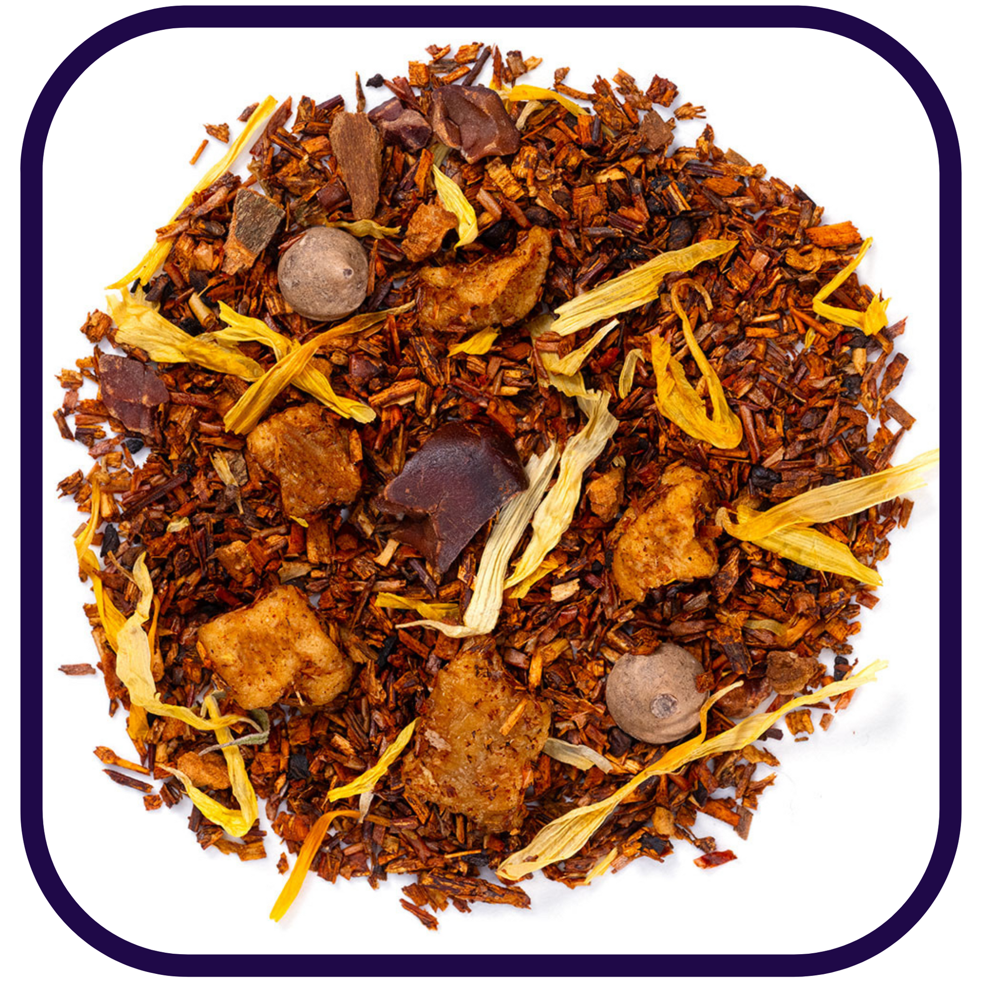 Ingredients: rooibos tea, apple pieces, cinnamon, dark chocolate chips (organic cane sugar, organic chocolate liquor (cocoa mass) and organic cocoa butter), cocoa nibs, chicory, natural caramel flavor, pecan flavor, marigold flowers & natural chocolate flavor