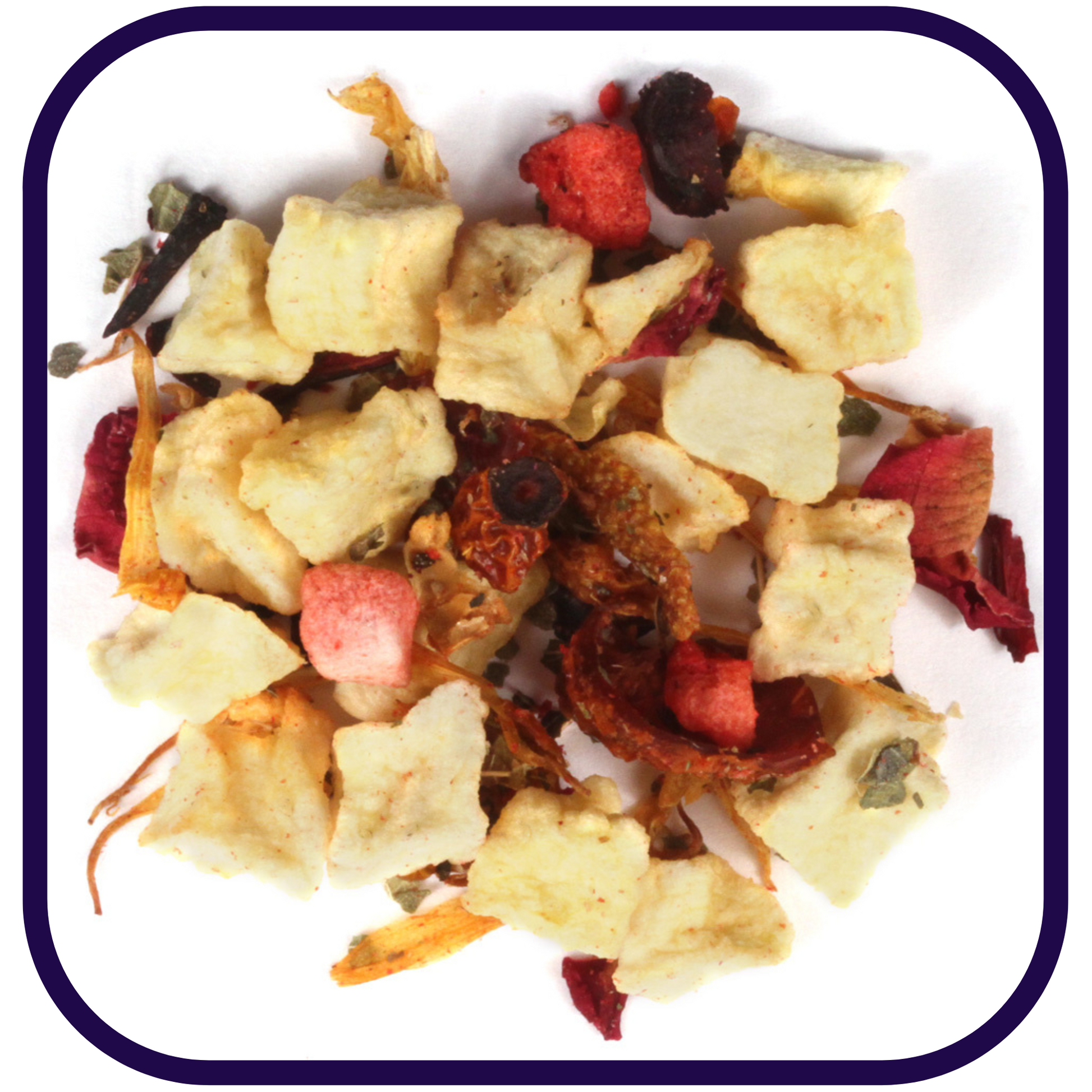 Ingredients: apple pieces, hibiscus, rose hips, orange, lemon verbena, dragonfruit, dragonfruit flavor, pineapple pieces, marigold flowers, strawberries & rose petals