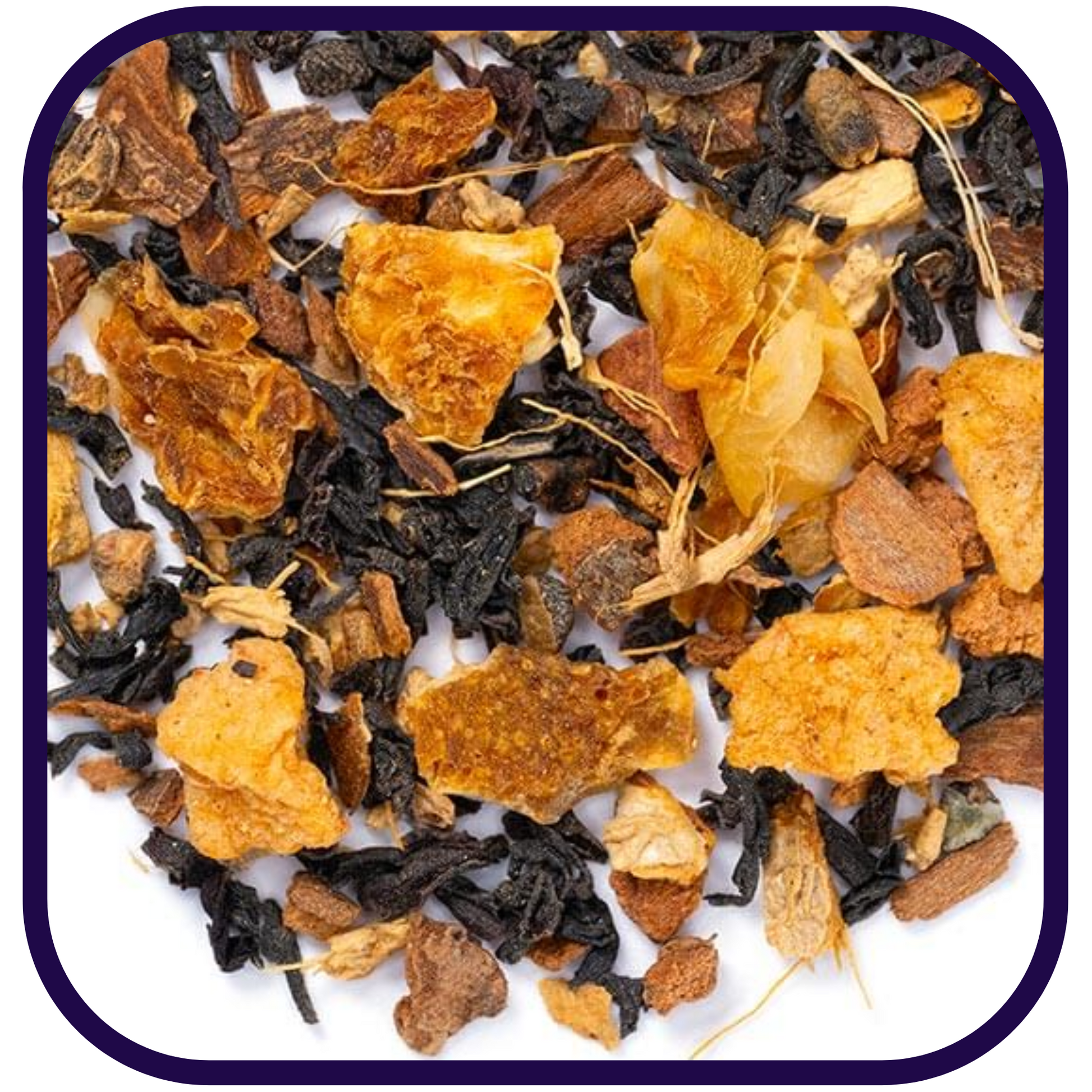 Ingredients: Black Tea, Cinnamon, Ginger, Cardamom, Orange, Cloves, Apple Pieces, Natural Apple Flavor & Natural Cinnamon Flavor